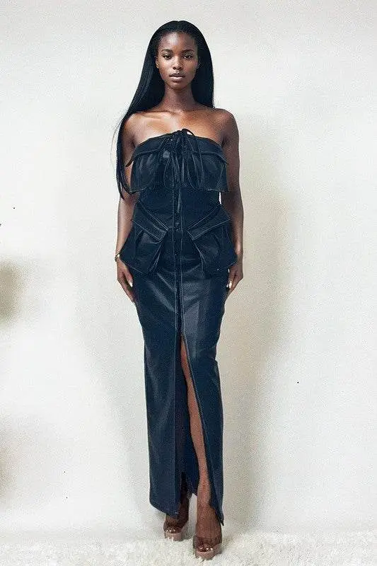Introducing the Athina Button Detailed PU Black Leather Dress, a sartorial masterpiece designed for the woman who owns the night. This dress exudes sophistication and allure, crafted from a luxurious, fluid PU leather that captures the essence of elegance.