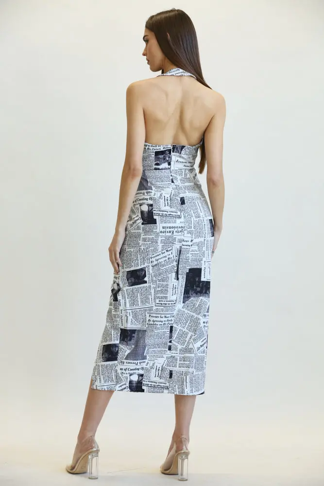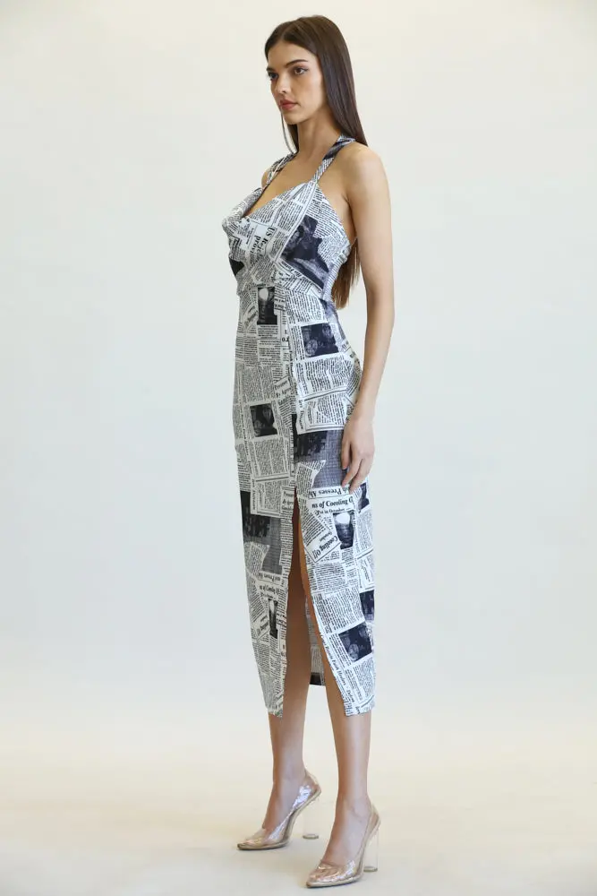 The Elsie Dress is your ultimate fashion statement with its striking newspaper print pattern and elegant cowl neckline. This head-turning piece features halter shoulder straps with buckle detail, a daring front leg slit, and a convenient zipper back closure, ensuring both style and comfort.